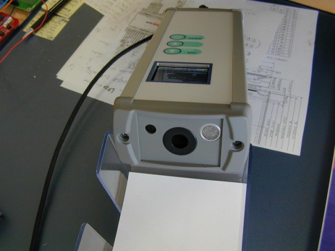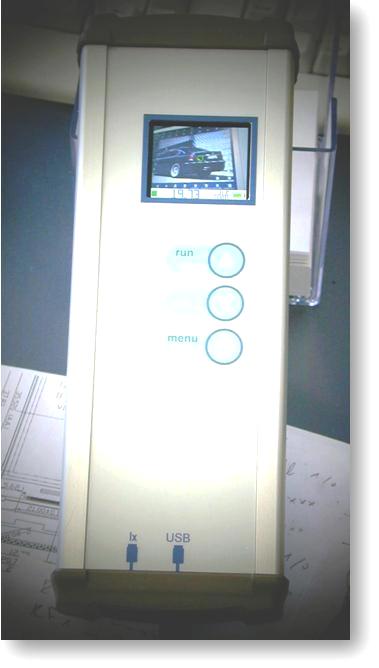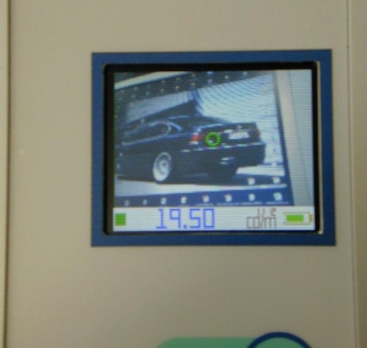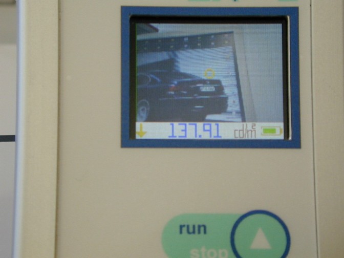 Therefore, this instrument is designed to respond to the questions above. It contains a camera that displays continually 5 images/sec on a 2" TFT display, so that one can see the zone of the monitor the instrument is oriented to. The instrument catches continually light and calculates it into cd/m2 and displays the value. An Ultra-Sonic is also integrated to measure the distance between the instrument and the display.
